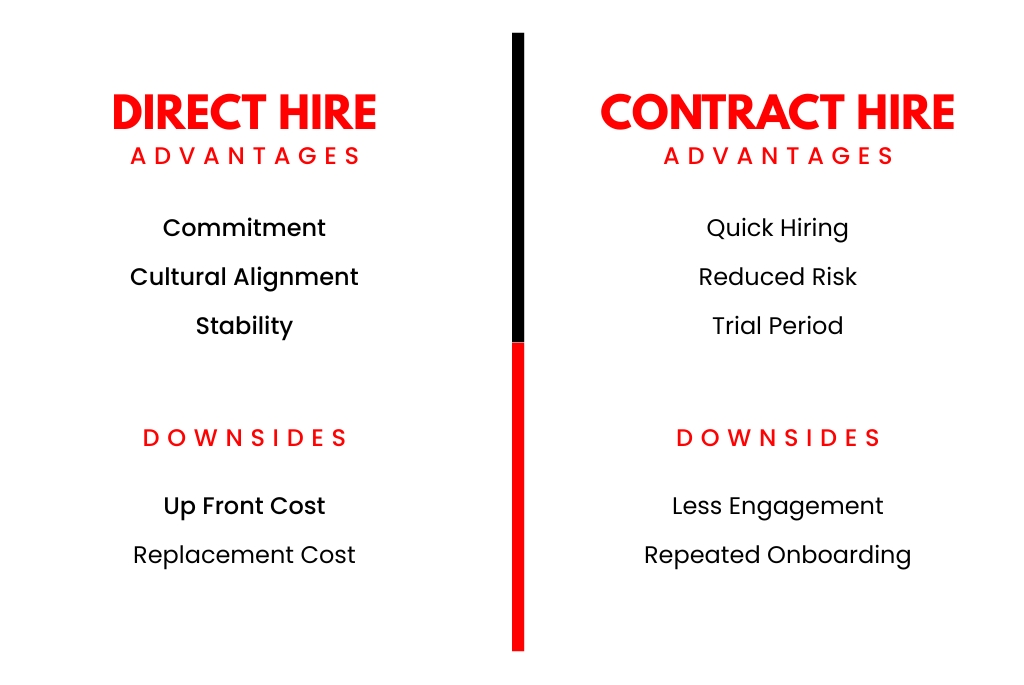 Use direct hire when you want stability, long-term culture alignment, and deeper organizational investment.